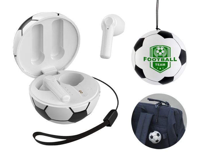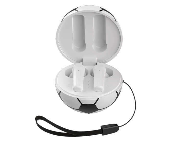 GOAL - Audífonos TWS inalámbricos Bluetooth con estuche de carga de 220 mAh en forma de balón de fútbol soccer. Cuentan con función de manos libres, alcance de hasta 10 m, entrada tipo C (incluye cable) y correa para transporte. Compatibles con dispositivos Android e iOS. Presentación: Caja a color.