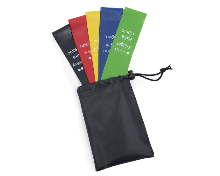 GYMTIME - Set de ligas de resistencia de latex antiadherible de diferente tensión para ejercicio 5 en 1: cada liga cuenta con diferente tipo de dureza de acuerdo al nivel de ejercicio: color verde - extra ligero, azul - ligero, amarillo - medio, rojo - pesado y negro - extrapesado. Cuenta con funda con jareta para guardar.
