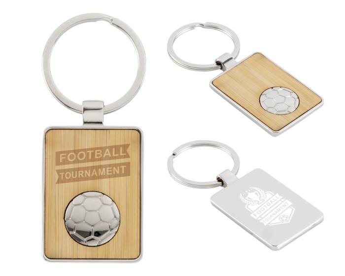 MESSI - Llavero de bambú con balón metálico de futbol de soccer. Presentación: Caja individual.