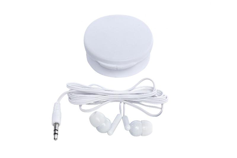 AUDÍFONO IN BOX . Audífonos en estuche circular con auriculares de 117 cm aprox.