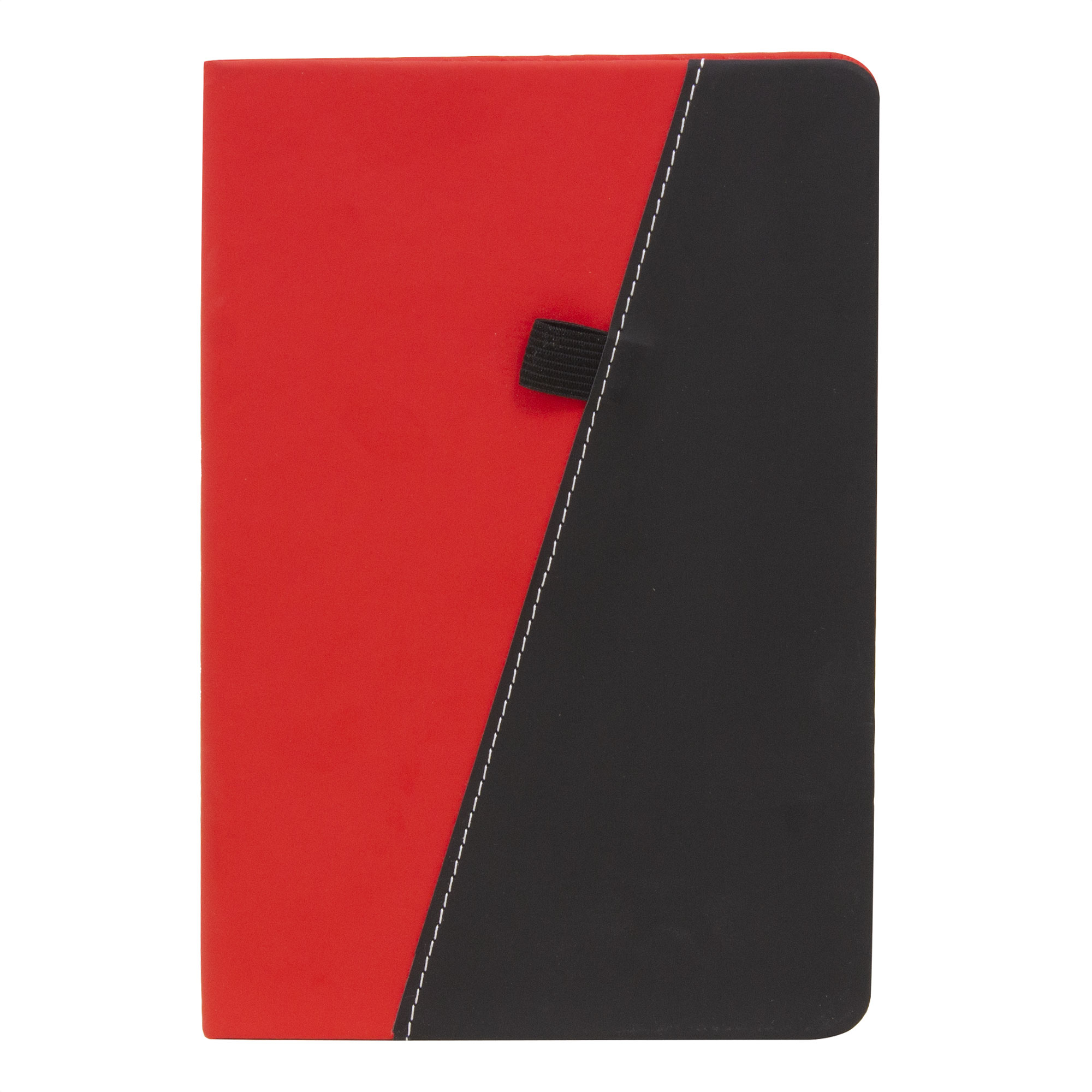 Libreta "TREK" Libreta. Tapa de cartón rígido recubierta en poliuretano bicolor (diferentes colores combinados con negro). Interior de 80 hojas rayadas en papel obra de 70g. Encuadernación cosida. Inlcuye portalápices elástico color negro