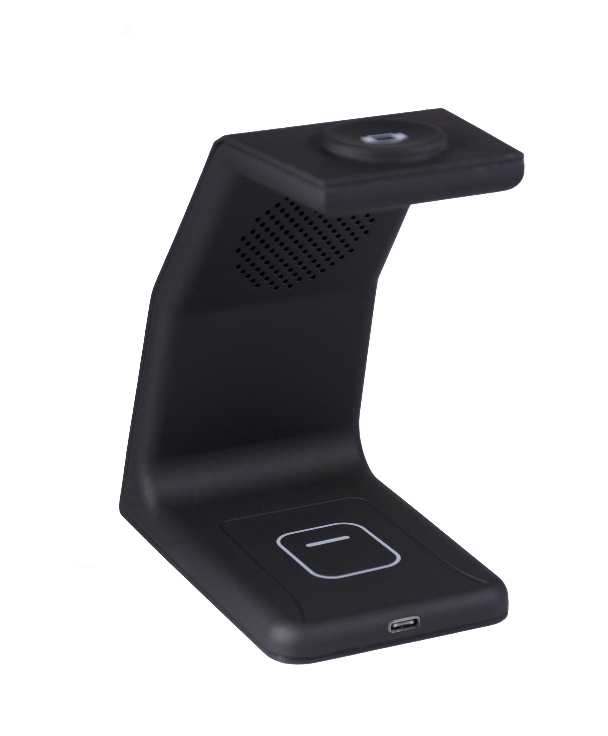 Estación de carga inalámbrica con carga simultánea para smartwatch, smartphone y auriculares en un solo dispositivo.