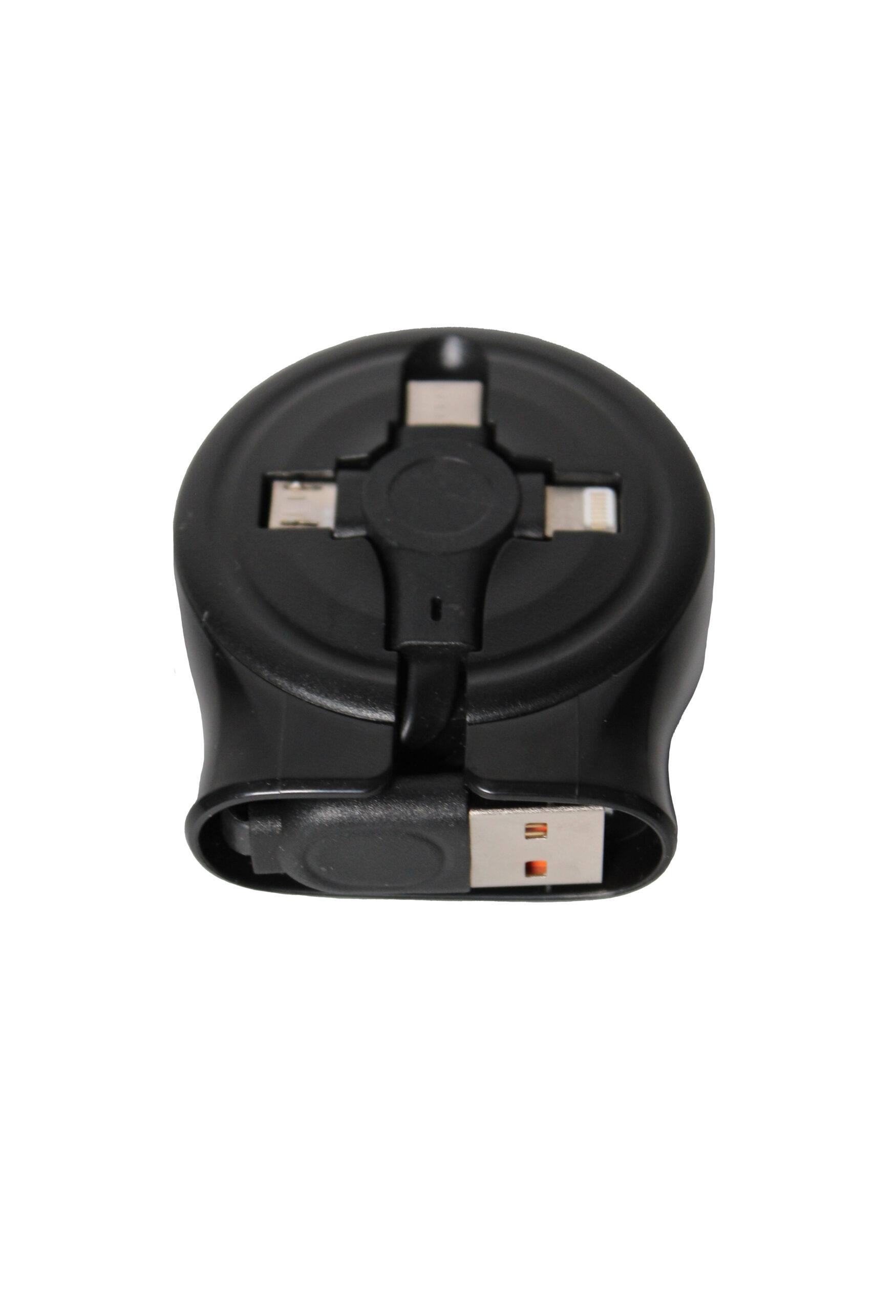 Cargador “Telescopio” 3 en 1 con cables retráctiles: micro USB, USB tipo C y Lightning.