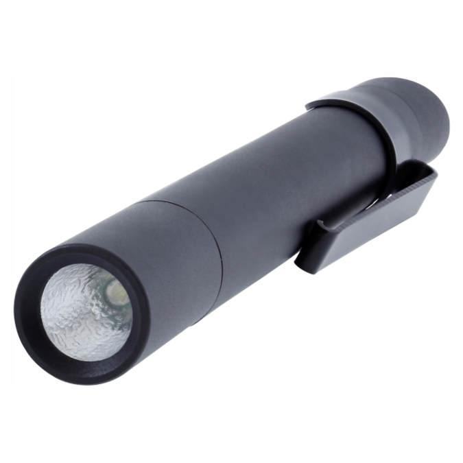 Linterna Lux Linterna de bolsillo color negro mate. Cuenta con clip para sujetarla al bolsillo, mismo que puede retirarse si así lo prefiere el usuario. Luz led de alta luminosidad. Mecanismo retráctil. Funciona con 2 baterías AAA (No incluidas).